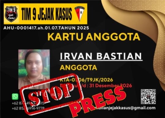 PANGKALPINANG MIOnline.klick — Organisasi Tim 9 Jejak Kasus secara resmi mengeluarkan pengumuman Stop Press terkait pencabutan kartu tanda anggota (KTA) atas nama Irvan Bastian. Pengumuman ini disampaikan sebagai pemberitahuan terbuka kepada masyarakat bahwa kartu anggota yang bersangkutan tidak lagi berlaku dan tidak dapat digunakan untuk aktivitas apa pun yang mengatasnamakan organisasi tersebut.